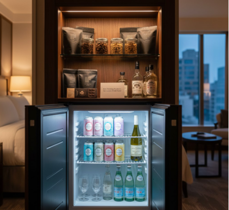 In a luxury hotel, the visual appeal matters as much as the product itself. Opt for sleek, elegant packaging, like solid glass jars or custom-branded matte pouches, that complement your room's design. The mini bar itself should feel like a piece of high-end furniture, not just a fridge.