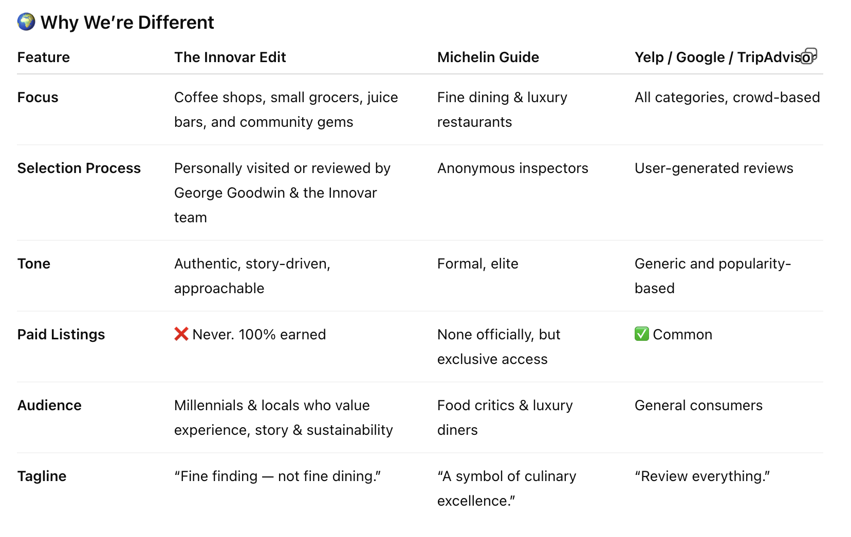 While platforms like Michelin Guide, Travel Advisor, Yelp, and Google focus on fine dining or paid promotions, The Innovar Edit is built on something different: authentic experiences, local ownership, and honest storytelling.